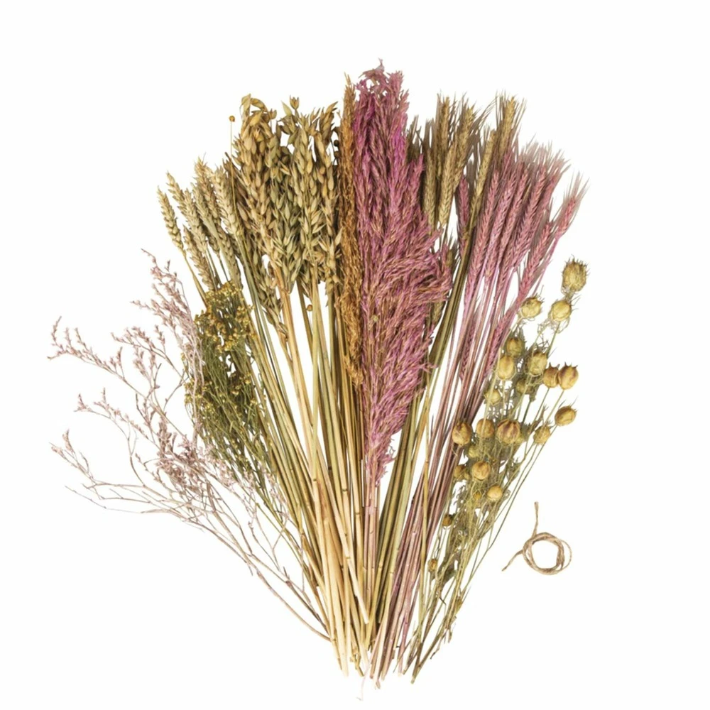 Créez votre propre bouquet de fleurs séchées grâce à cet assortiment de différentes fleurs, ce lot contient : des triticales ( blé ), des avenas (avoine), des triticum linium ( petit épeautre ), des reeds plume , des broom bloom, des statice tatarica (lavande de mer) et un cordon pour attacher les fleurs entres elles. Ces fleurs sont idéales pour la fabrication de bouquets, ou encore d’anneaux en bois, métal ou bambou avec des fleurs séchées, cela vous permettra de créer une décoration unique et intemporelle de manière simple et rapide. Découvrez également tous nos anneaux (bois, bambou, métal) pour la confection de vos suspensions fleuries aisni que nos vases pour vos bouquets.